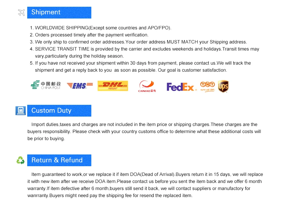 If the product you receive is not as described or low quality, the seller promises that you may return it before order completion (when you click "Confirm Order Received" or exceed confirmation timeframe) and receive a full refund. The return shipping fee will be paid by you. Or, you can choose to keep the product and agree the refund amount directly with the seller.N.B.: If the seller provides the "Longer Protection" service on this product, you may ask for refund up to 15 days after order completion.